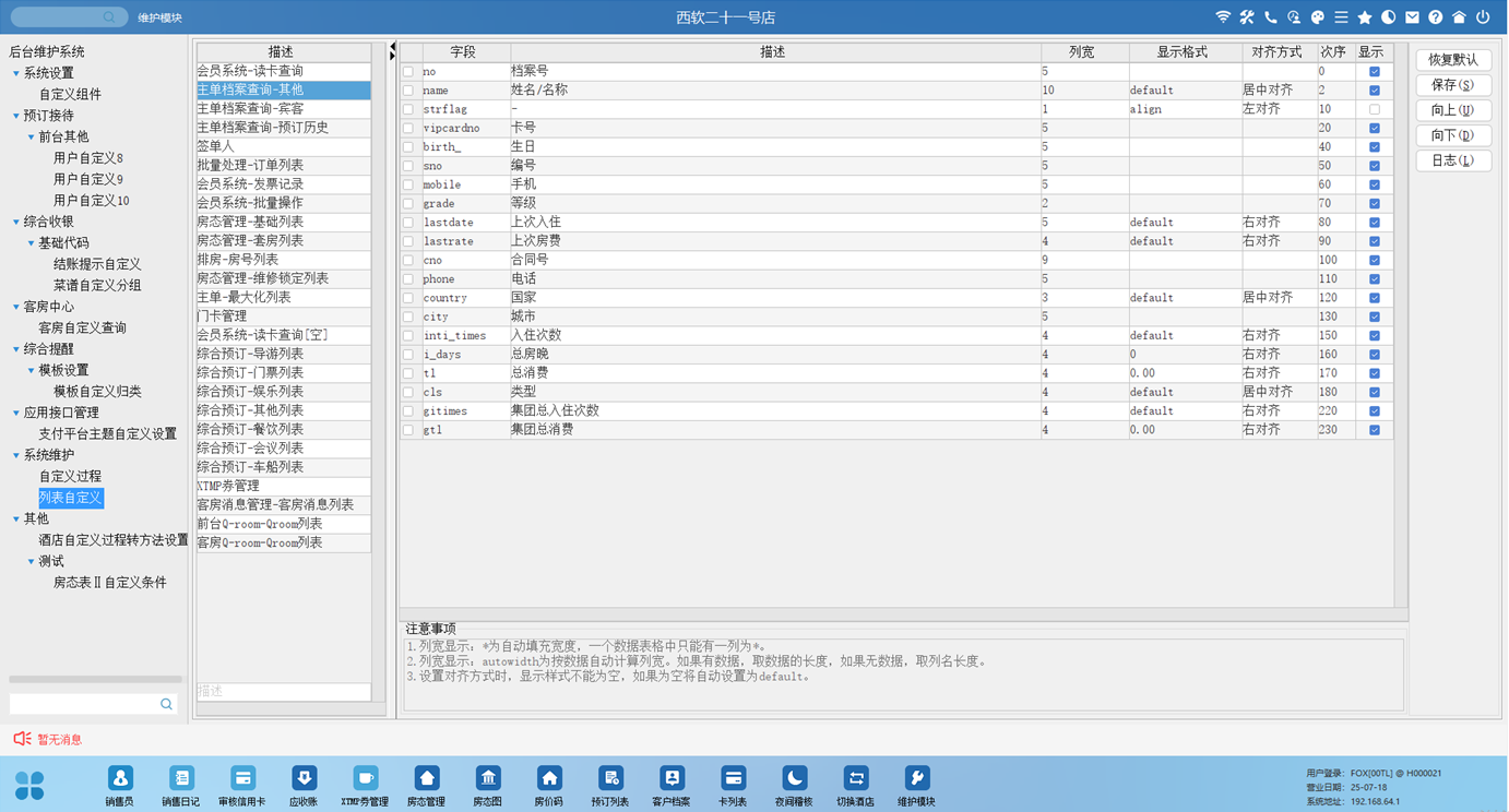 设置入口:维护模块-系统维护-列自定义-主单档案查询-宾客/其他