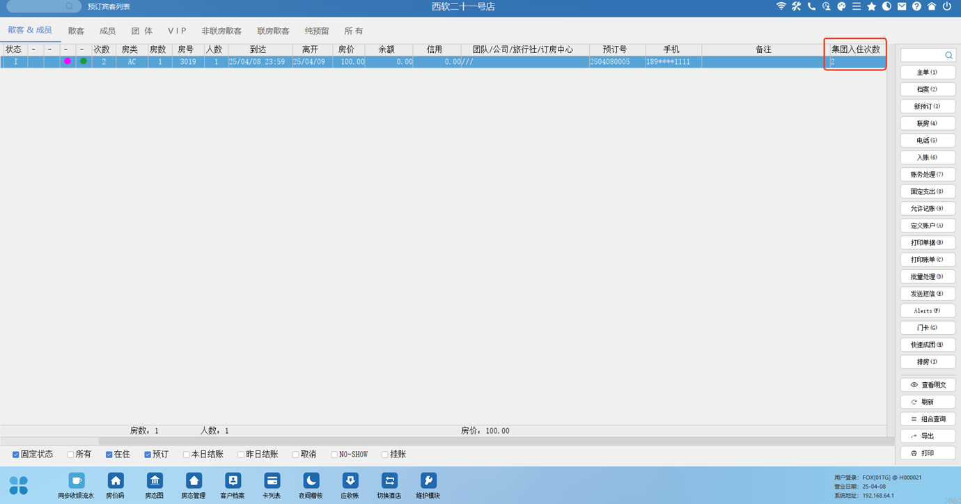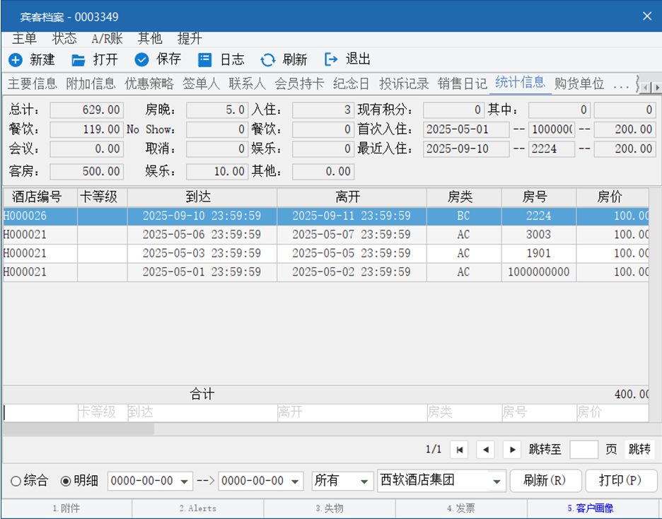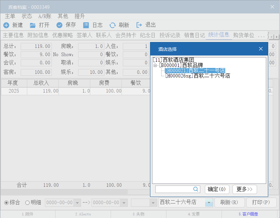 单店支持查看客户档案在全集团总入住次数、总消费和在其他酒店产生消费数据。