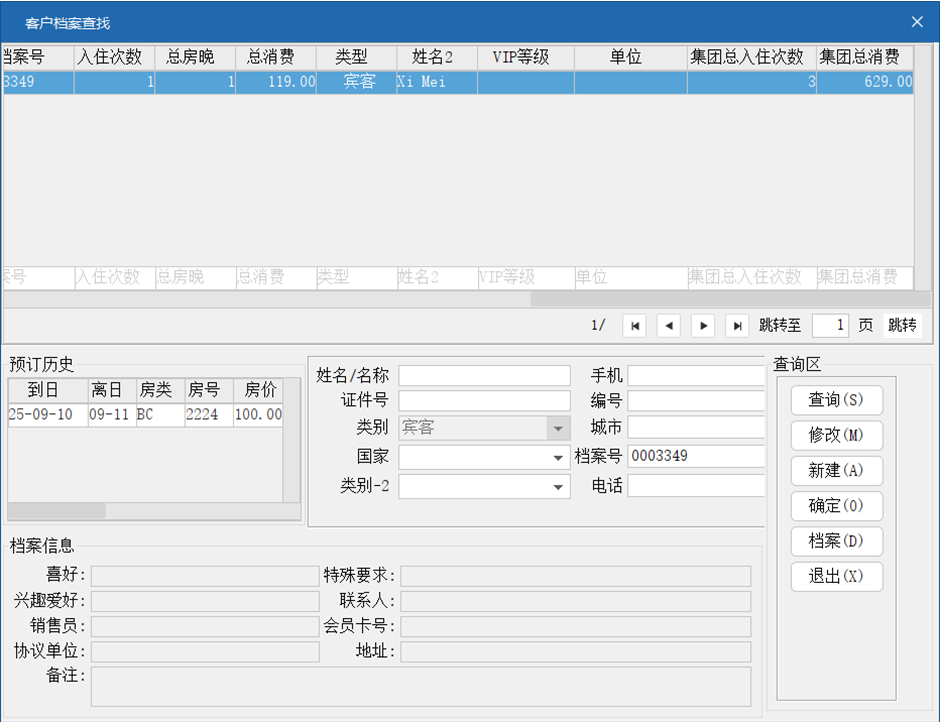 (1)档案查询界面支持自定义显示集团总入住次数和集团总消费列;