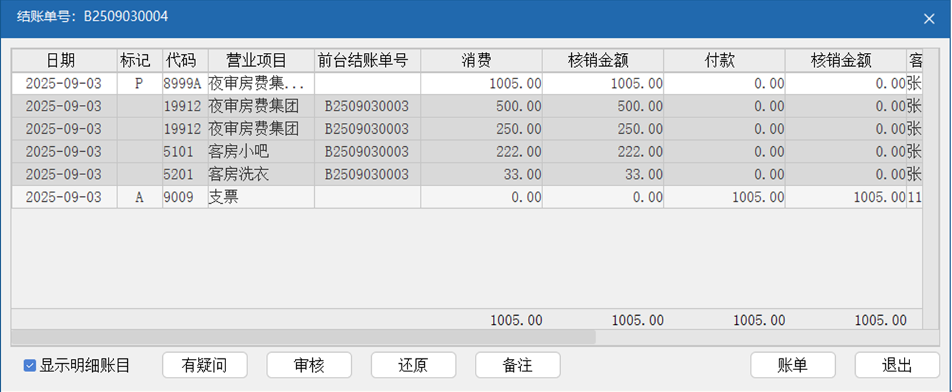 (2)双击可查看明细,并在明细窗口支持审核状态更新(有疑问、审核、还原)及审核备注记录。同时支持此界面查看此次核销的账单;