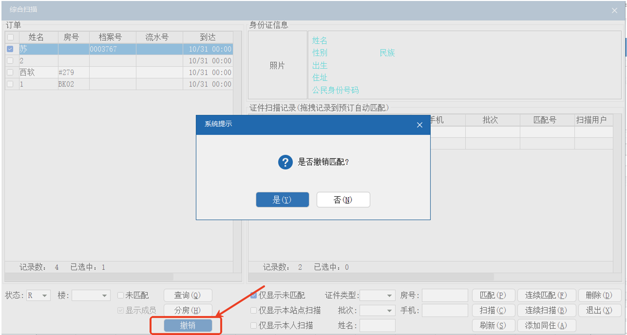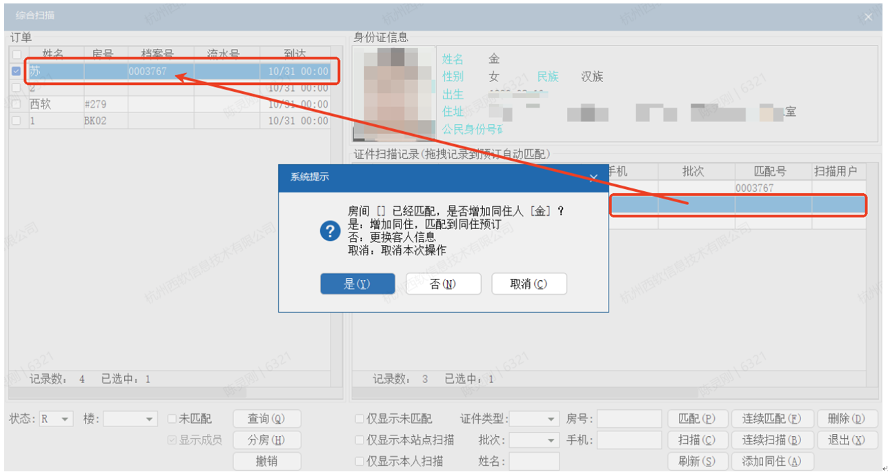 (1)增加拖拽匹配功能。拖拽扫描记录至未匹配订单,可直接匹配成功;拖拽扫描记录至已匹配订单,可选择操作,是:增加同住,匹配到同住预订;否:更换客人信息;取消:取消本次操作。