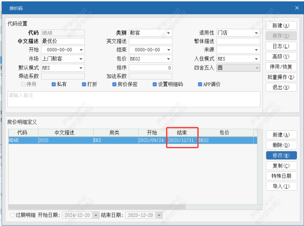 事项一:检查房价码中房价明细的有效期,路径:销售->房价码