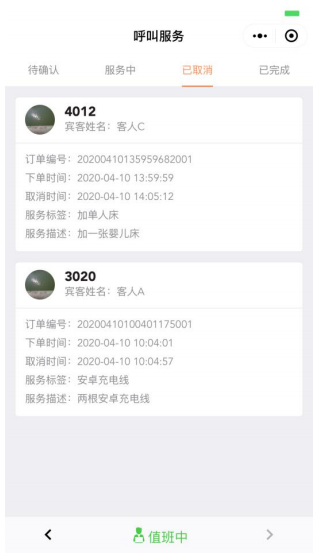 今日客人提交的所有新服务订单,显示在待确认订单列表中,管理员可对待确认的订单 进行取消服务和确认服务操作。 点击〖取消服务〗按钮,提示确认要取消服务,点击〖确认〗,服务取消成功,跳转到 已取消列表中,如图: