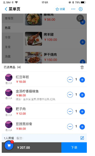 1.购物车页面需要增加点菜时,可以直接点击左下角〖点菜〗按钮完成加菜操作。