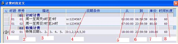 第二条是从00:00:00到03:59:59。位置7的单价是收费价格,按照位置8的时间长度来填写,时间长度的单位为1分钟。