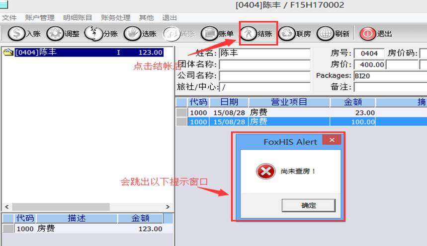 不然,就会跳出“尚未查房”的提示框来,并不能继续结帐。如(图5)所示