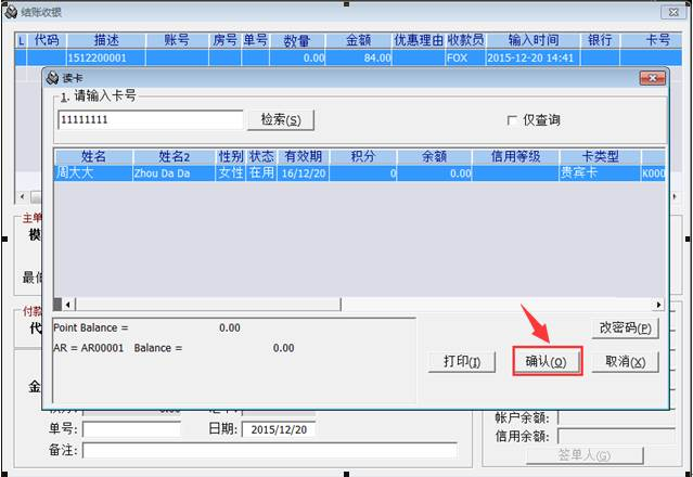 (2)系统显示相应贵宾卡信息后,单击〖确定〗,回到『结账』窗口。此时转账目标即为该贵宾卡的储值账号。
