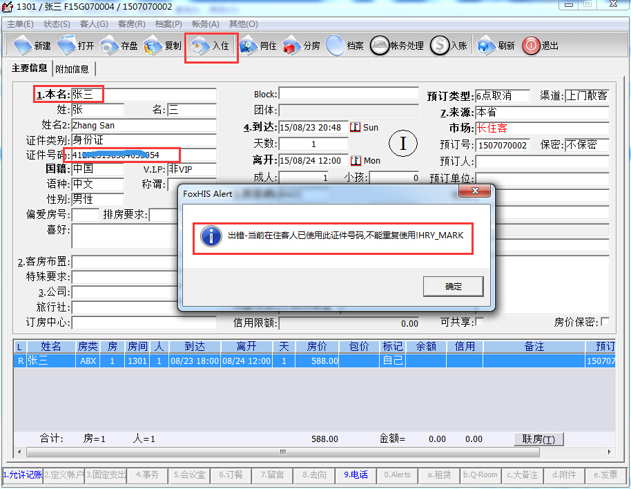设置为’T’,则在新的主单办理入住时,系统会搜寻”在住”的宾客中是否已经存在这个身份证,如果已经有了,则有如下提示,这个新的主单不能做”入住”操作。如下图
