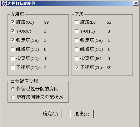 窗口上部是按房态分类复选钮,下部是是否保留已分配信息的单选钮。