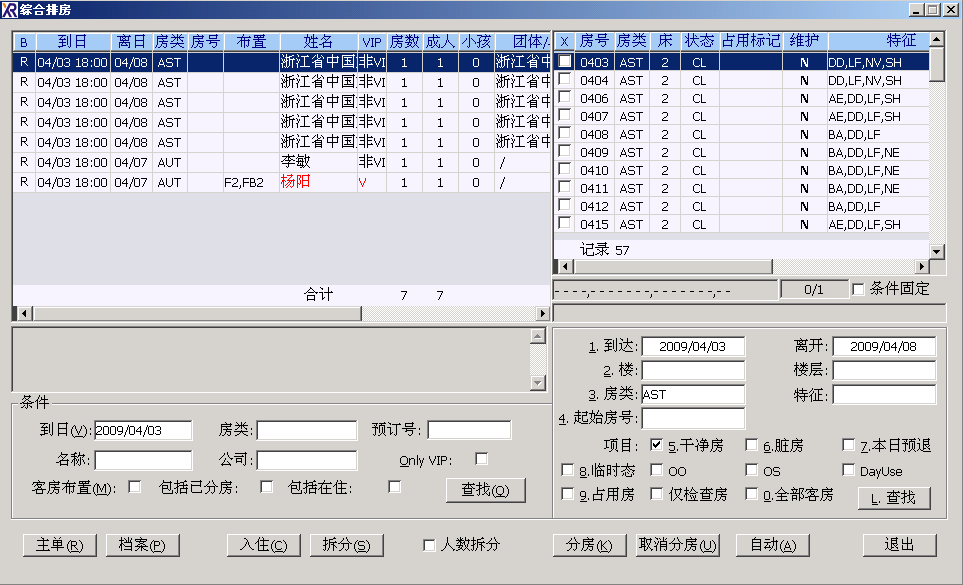 系统提供条件有:到达日期、房类、预定号、名称、公司、only VIP、客房布置、包括已分房、包括在住,如上图所示。