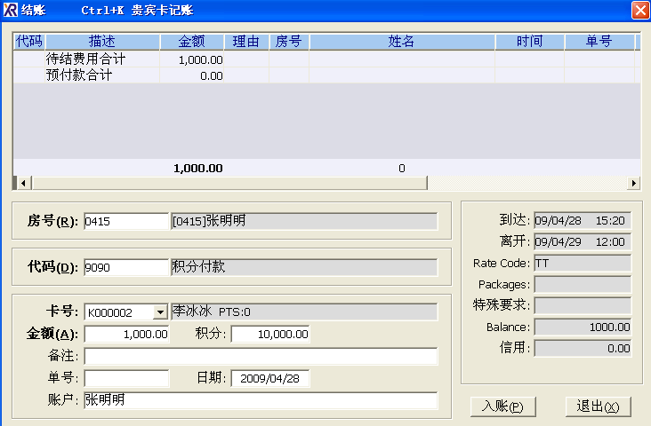 (1)、宾客结账时,进入『结账』窗口,在【代码】选项中选择“积分付款”的付款代码(根据系统设置不同,付款代码及名称可能不同命名)。如下图: