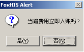 (3)、单击〖存盘〗,若已确认【地点】,系统将提示“当前费用立即入帐吗?”,单击〖是(Y)〗,直接入帐到客房;单击〖否(N)〗,帐务将显示在上方列表中,可以单击〖结帐〗,使用现金等其他付款方式结账。