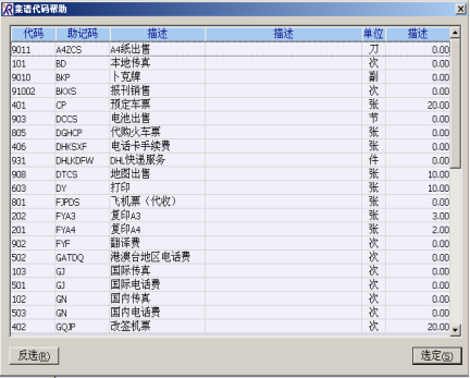 (3)将光标定位于【代码】处,按F2,打开菜谱代码帮助窗口,单击选择费用项目,可选择多条项目。如要取消已选中,再单击该项目即可。选择完成后,单击〖选定(S)〗。