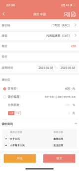 (1)当某些特定日期酒店需要对房价进行上浮或者下调时,可以通过调价申请进行操作,支持批量调价操作。如下图所示: