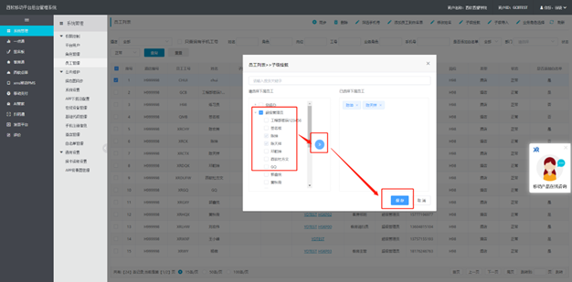 在其中选择对应的下属员工的工号,点击”》”号,后点击保存即可。如下图所示: