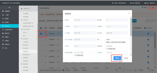 展开菜单管理列表,点击〖食品管理〗。食品管理列表界面(如下图所示),在该界面可对食品进行二维码、条形码的下载,启用/停用及 修改删除,在查询内容输入框中输入需查询的食品菜名,点击〖查询〗,即可查询出对应食品。