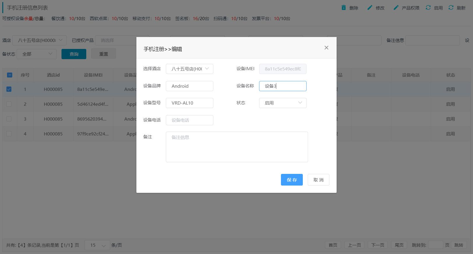 修改手机注册信息:选中需要修改的手机注册信息(不可多选),点击【修改】,在打开的手机注册>>编辑界面中修改信息,点击【保存】即可保存修改的信息,界面样式(如图 1.1.4-2所示)。