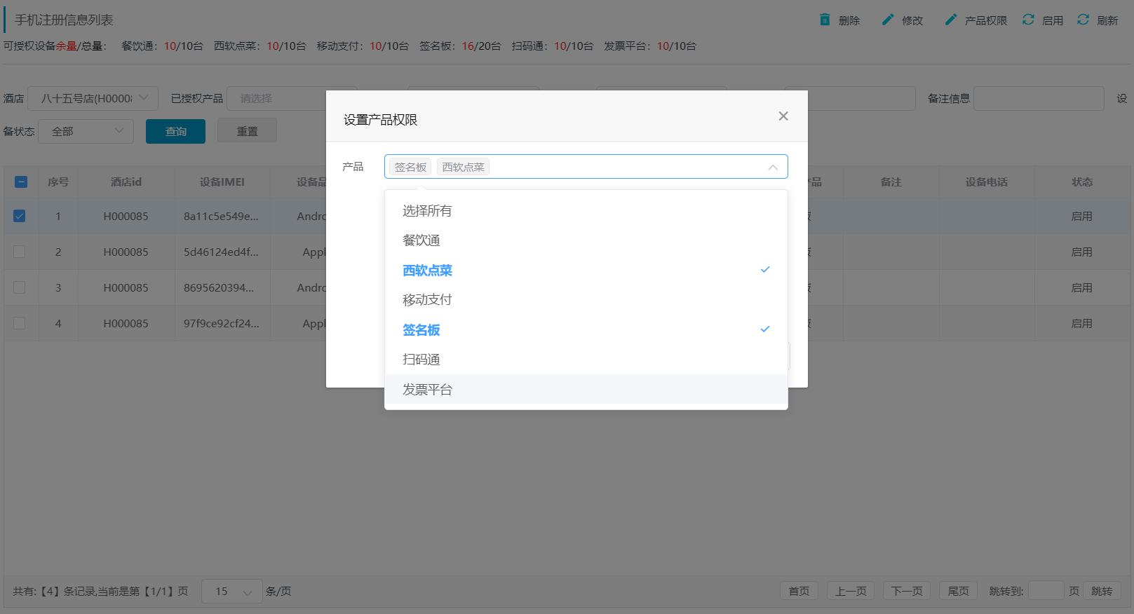 手机注册信息产品权限修改:选中需要修改产品权限的手机注册信息(不可多选),点击【产品权限】,在打开的设置产品权限界面中选择需要赋予的权限,点击保存即可成功该手机的产品权限,未授权的设备无法使用该产品。设置产品权限界面样式如图 1.1.4-3 所示。