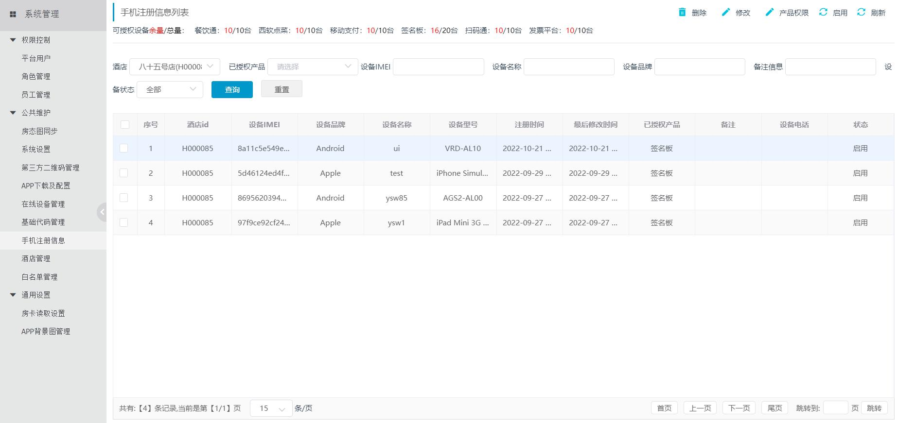 展开公共维护列表,点击【手机注册信息】。手机注册信息界面(如图 1.1.4-1 所示)显示的是所有在使用/待试用的设备列表,该记录可以自动获取也可手动添加,并可根据条件进行查询操作。