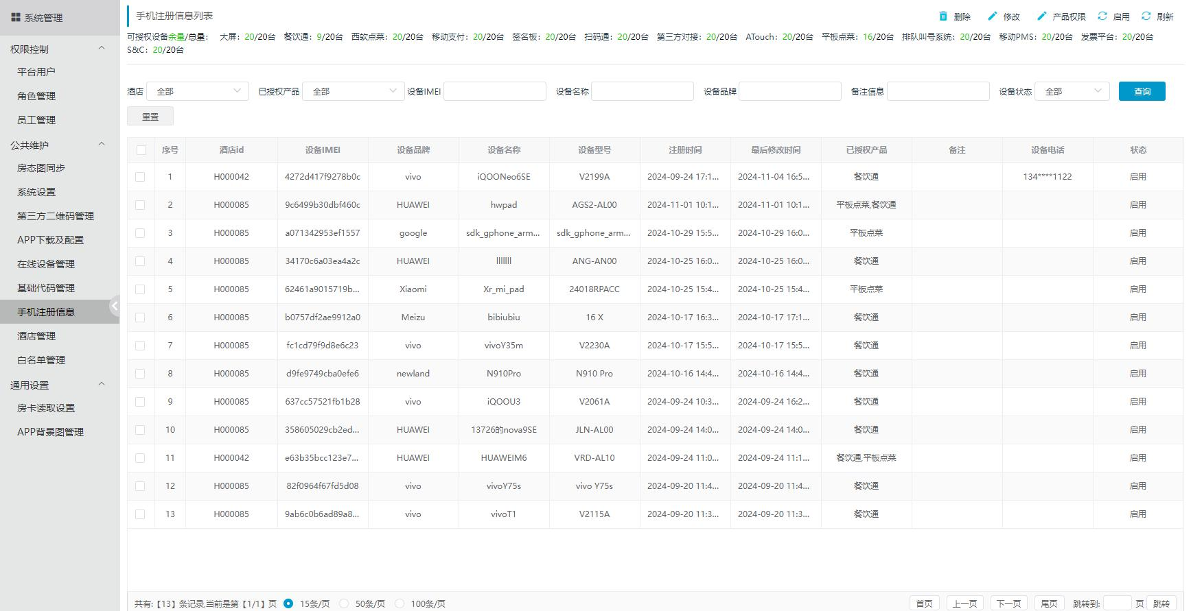 产品权限:选中需要修改产品权限的手机注册信息(不可多选),点击〖产品权限〗,在打开的设置产品权限界面中选择需要赋予的权限,点击保存即可成功修改该手机的产品权限,未授权的设备将无法使用。