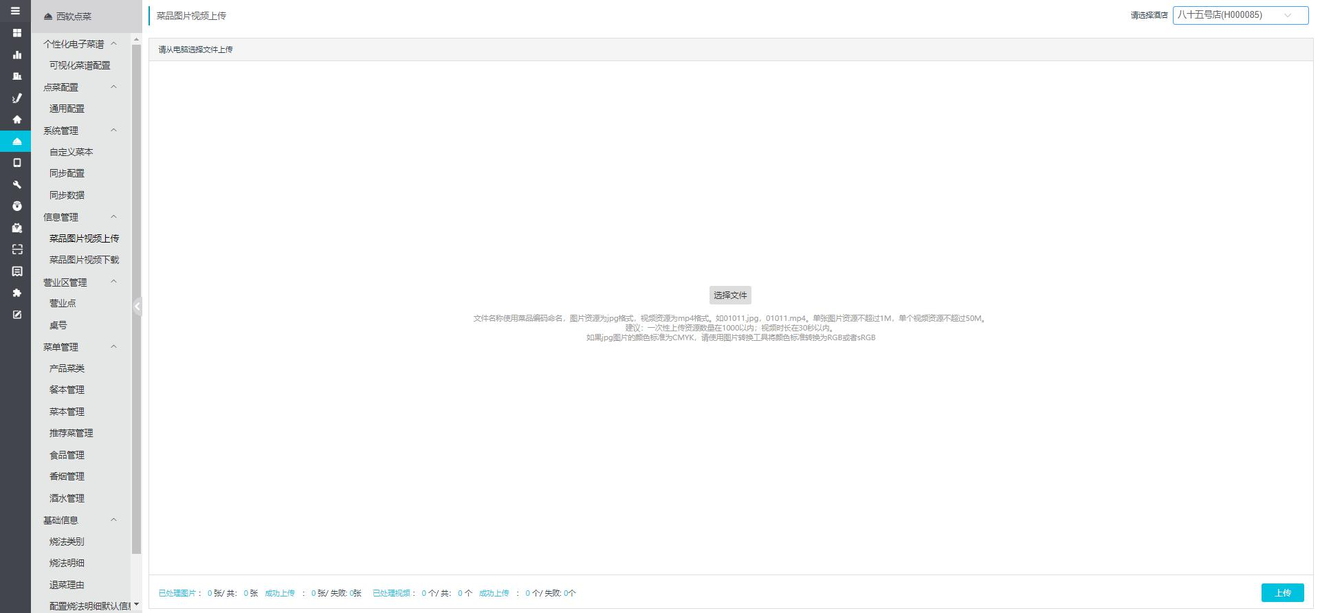展开信息管理列表,单击【菜品图片视频上传】。菜品图片视频上传界面(如图 1.3.3-1