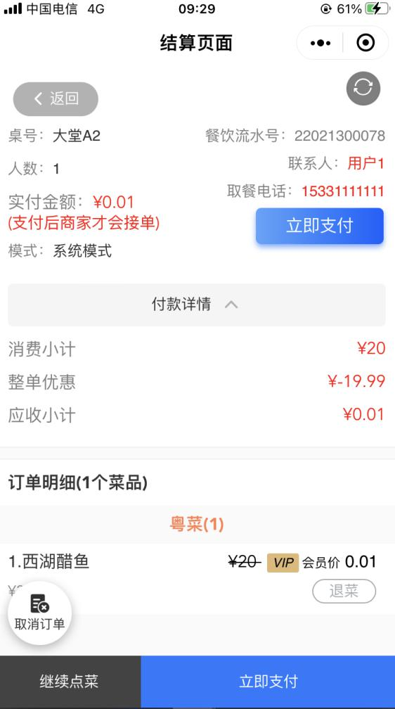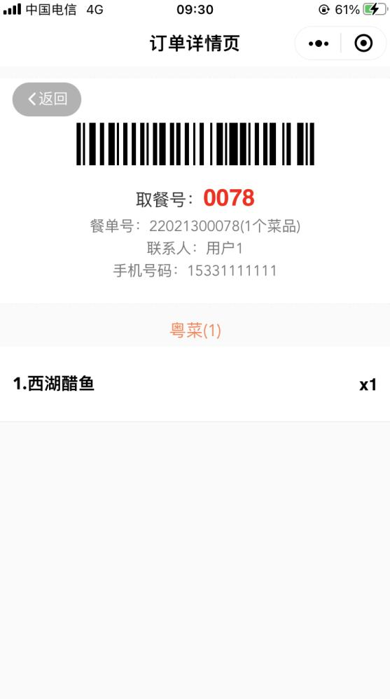 点击〖去结算〗跳转到『结算页面』,显示取餐电话(如图 1.3.5-6 所示),支付完成