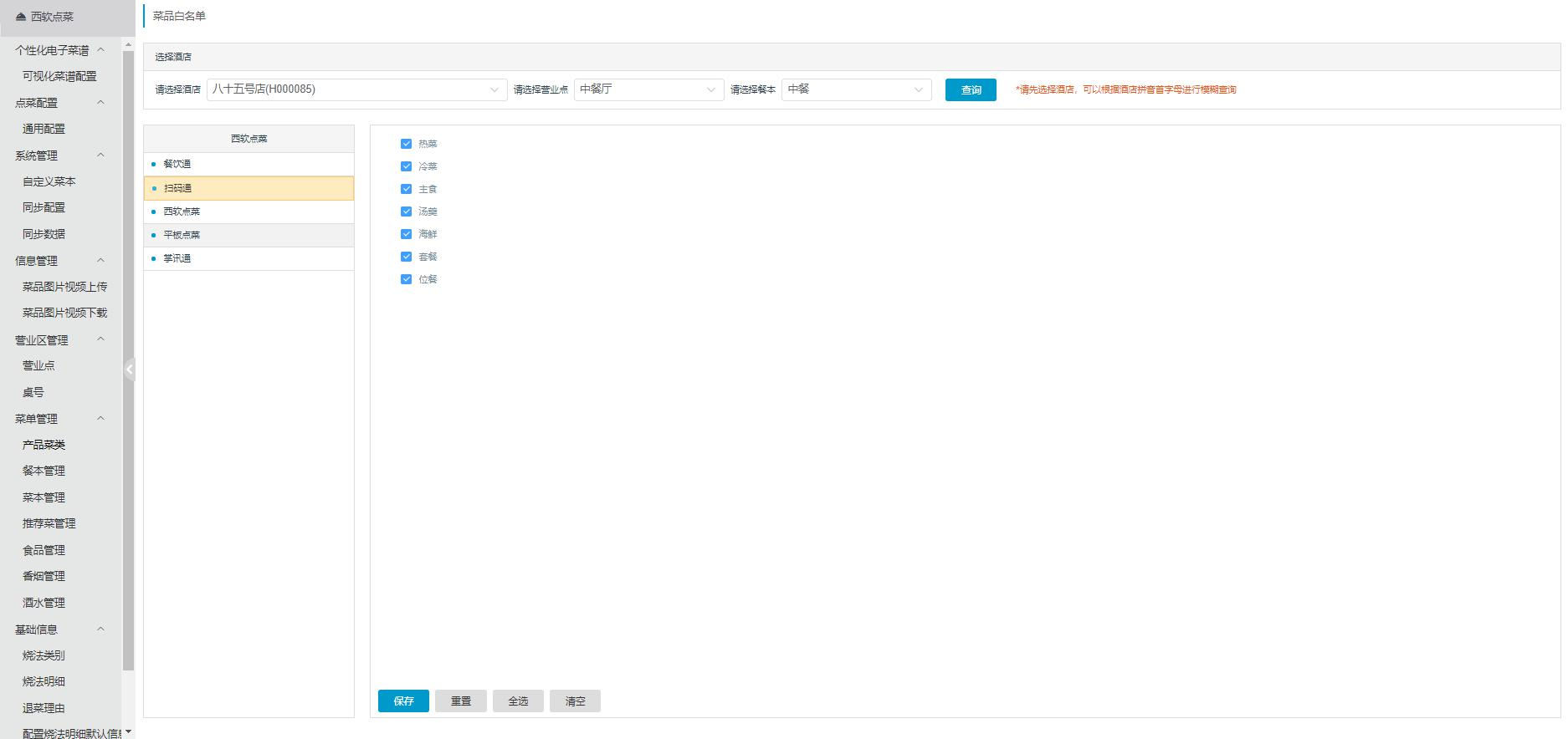 展开菜单管理列表,单击〖产品菜类〗。菜品白名单界面(如图 1.3.7-1 所示),选择