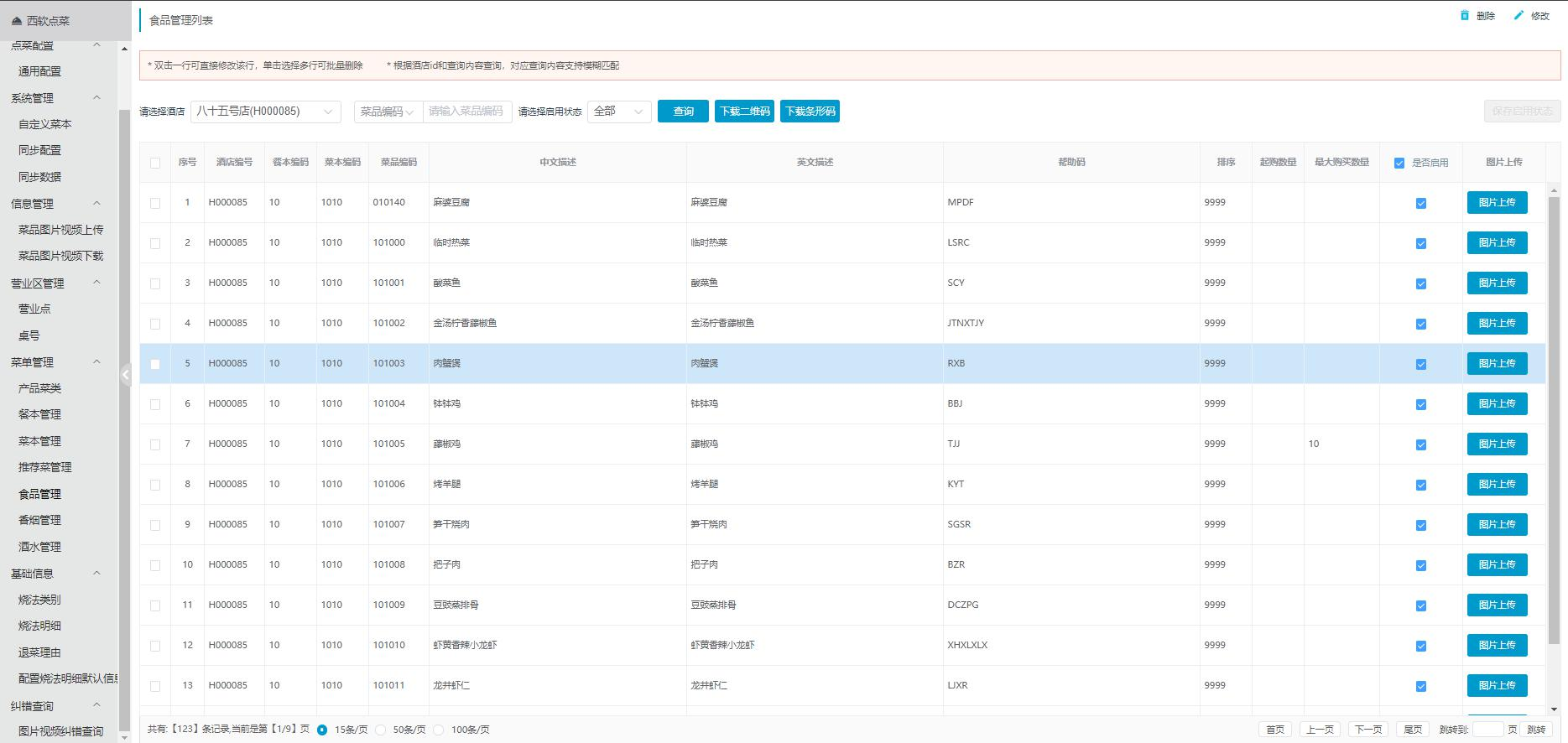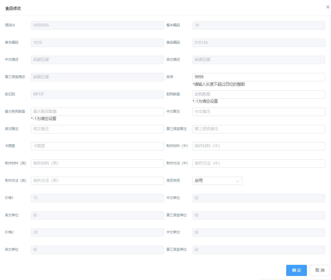 认显示该商户下所有酒店的设置为食品的菜品,在该界面可对食品进行启用/停用及修改删