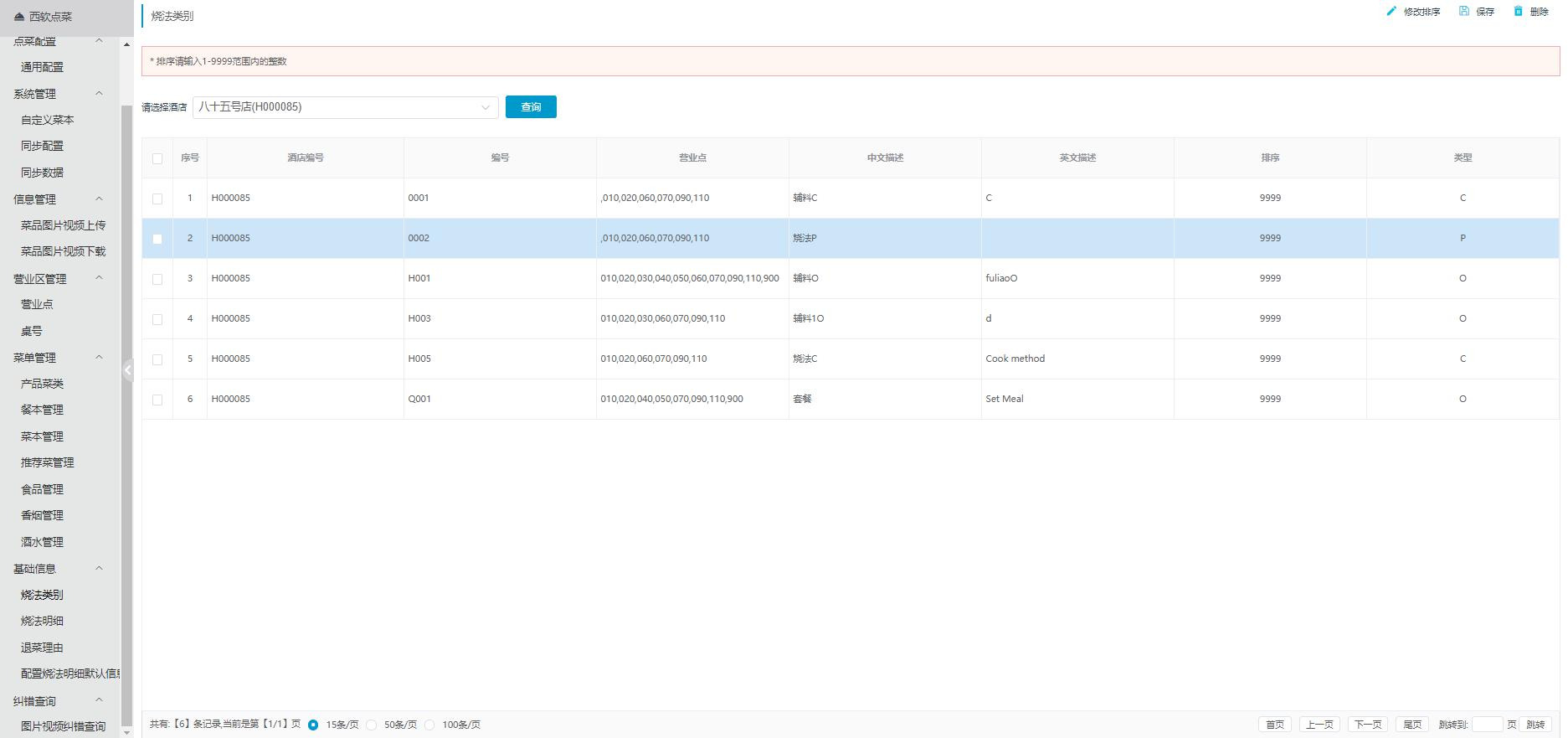 该商户下所有酒店已同步的烧法类别,在该界面可对烧法类别进行修改排序。