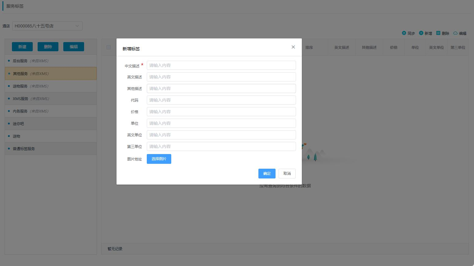新增服务明细:单击右上角〖新增〗按钮,打开『新增标签』,输入标签描述,代码,