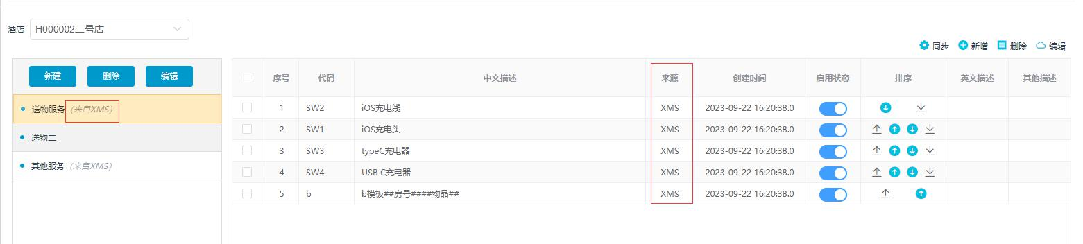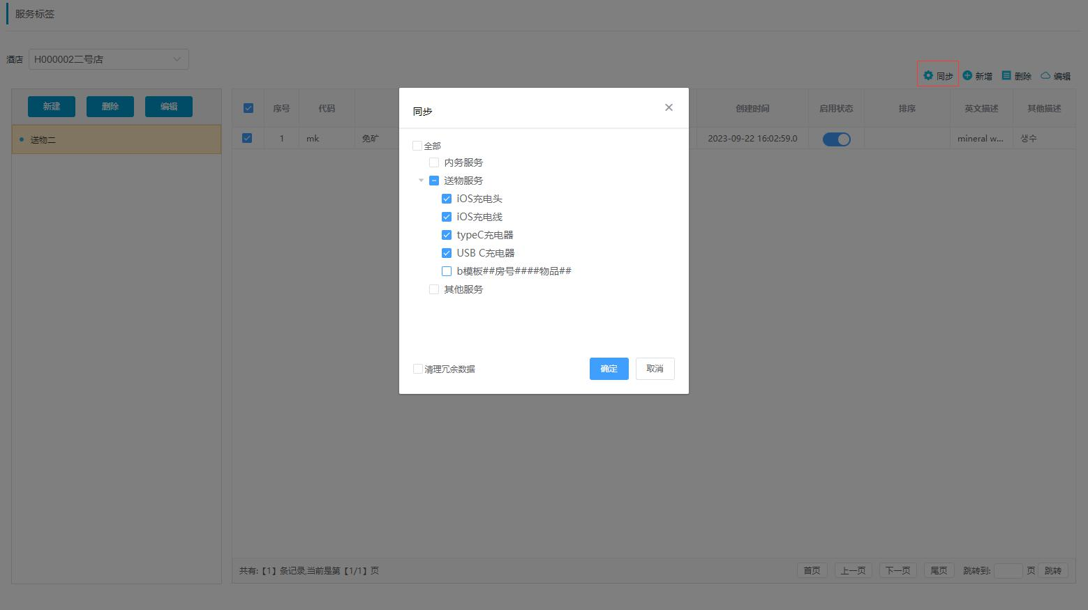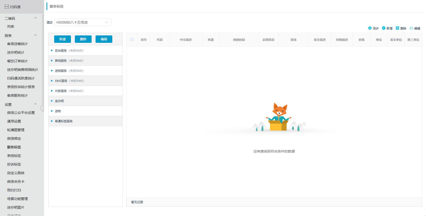 展开设置列表,单击〖服务标签〗,打开服务标签页面,默认显示酒店所有服务大类,