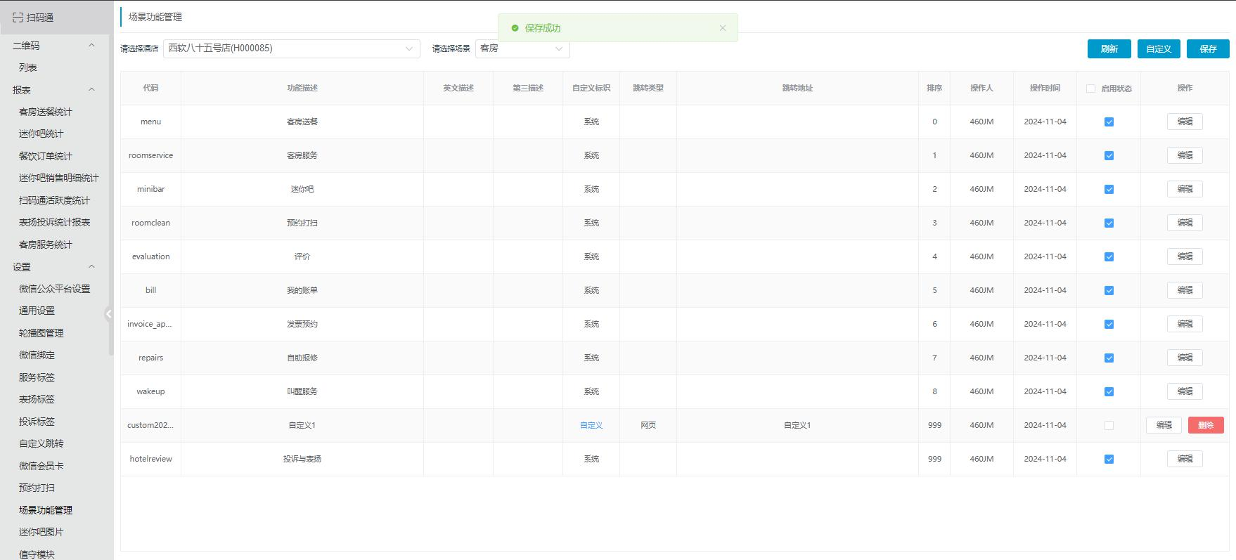 扫码通的场景分为客房、餐饮、发票和收款二维码。