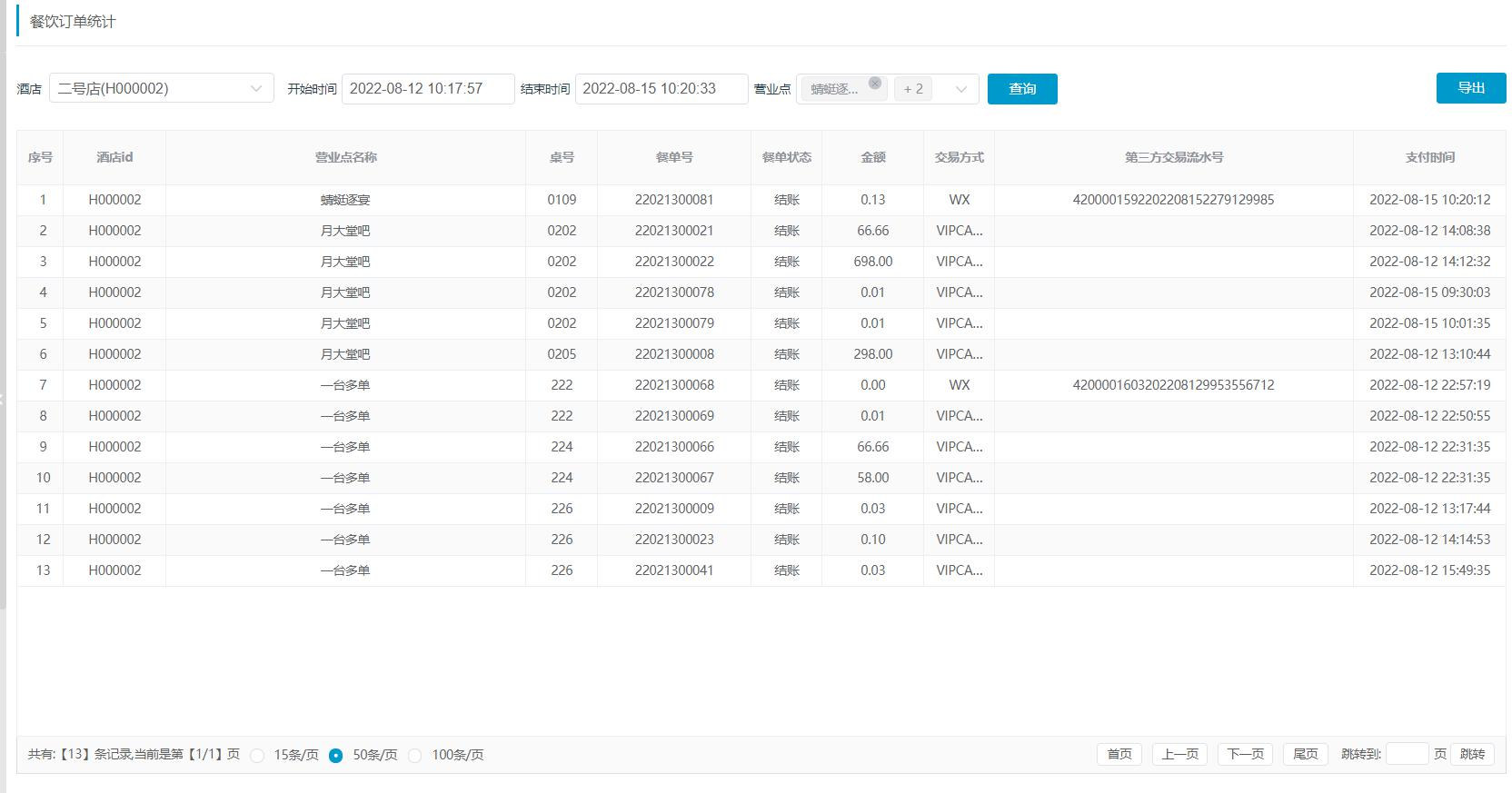 根据所选的酒店可以按时间段查询餐饮订单记录,点击〖导出〗按钮可以将记录导出为