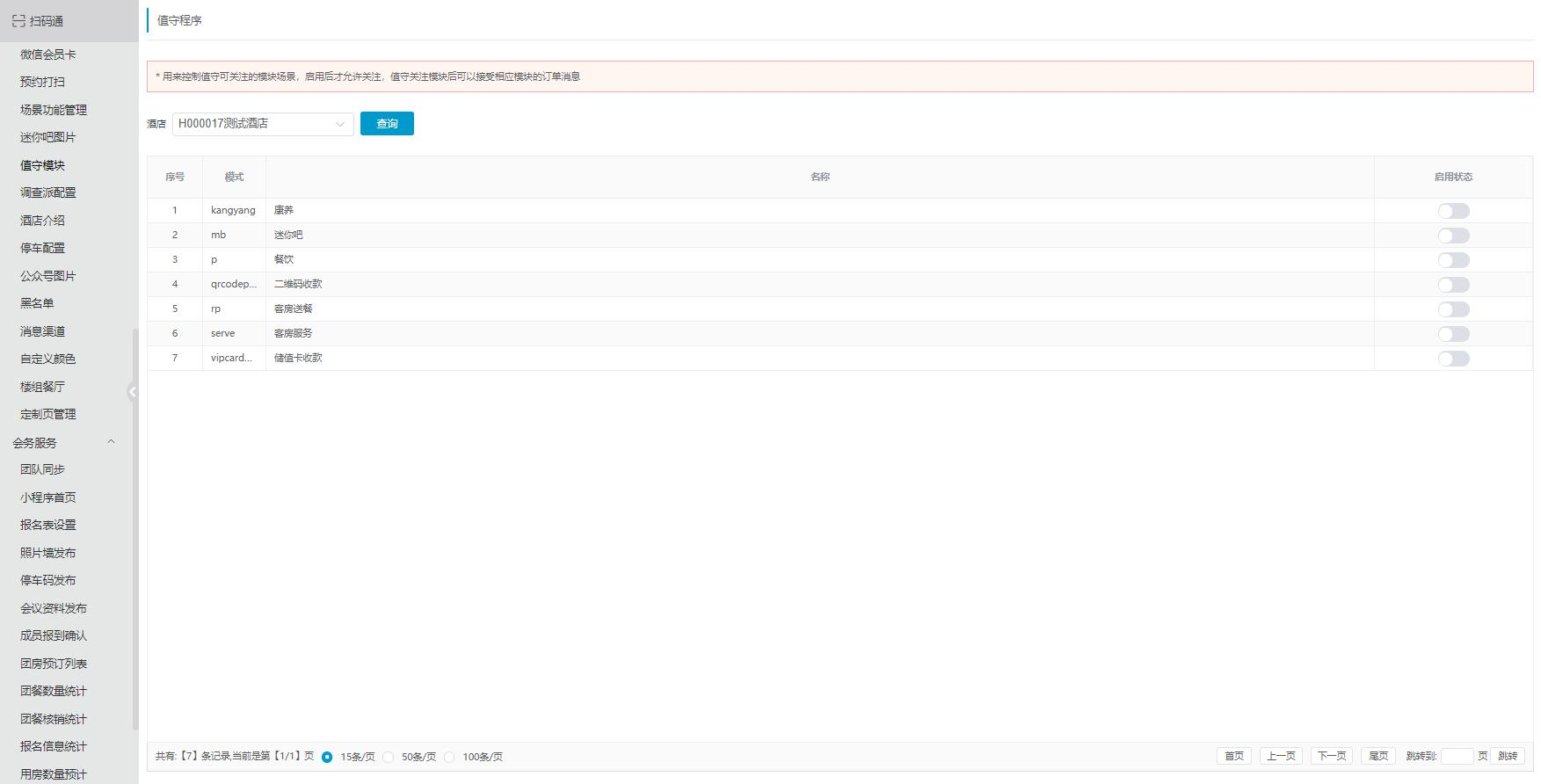 选择酒店后,用来控制值守可关注的模块场景,启用后才允许关注,值守关注模块后可