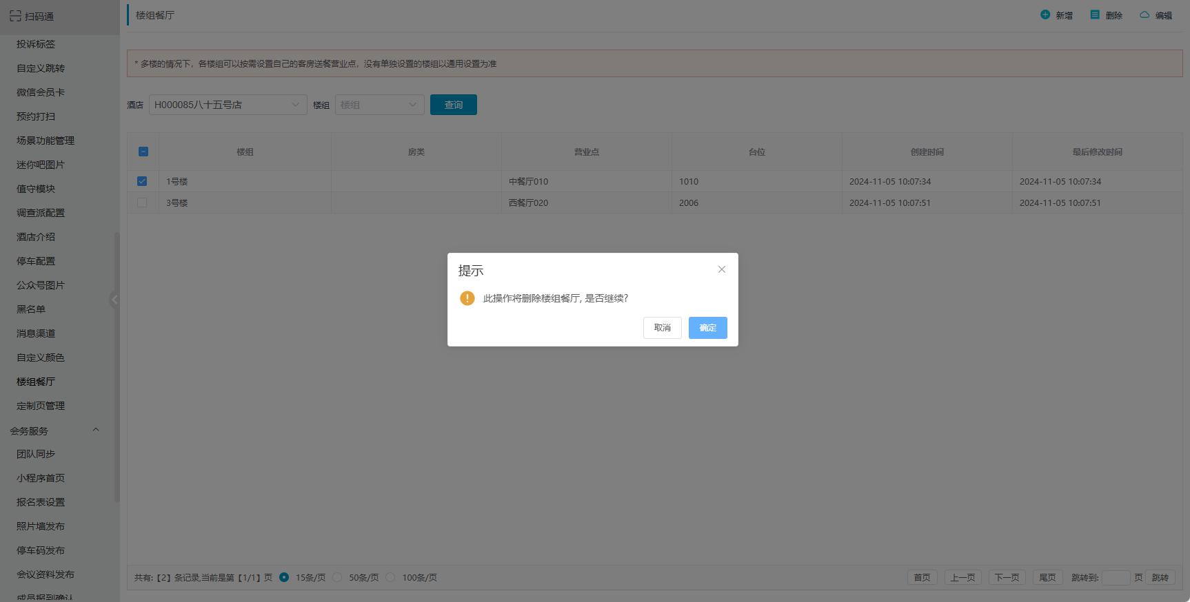 勾选要删除的楼组餐厅,点击〖删除〗按钮,提示此操作将删除楼组餐厅,是否继续,