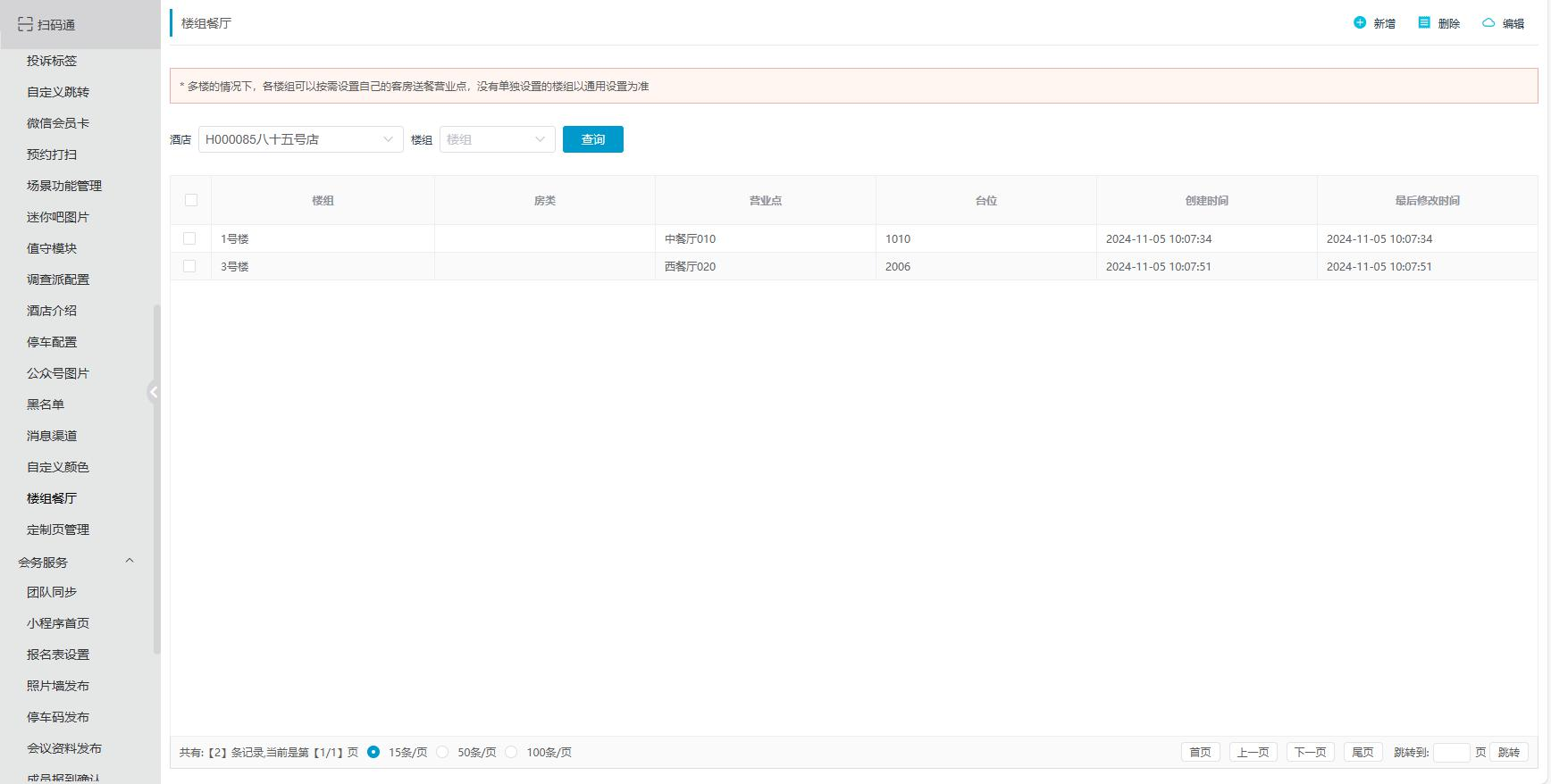 该功能主要适用于多楼的酒店。当酒店启用多楼时,可实现一个楼组对应一个营业点(如