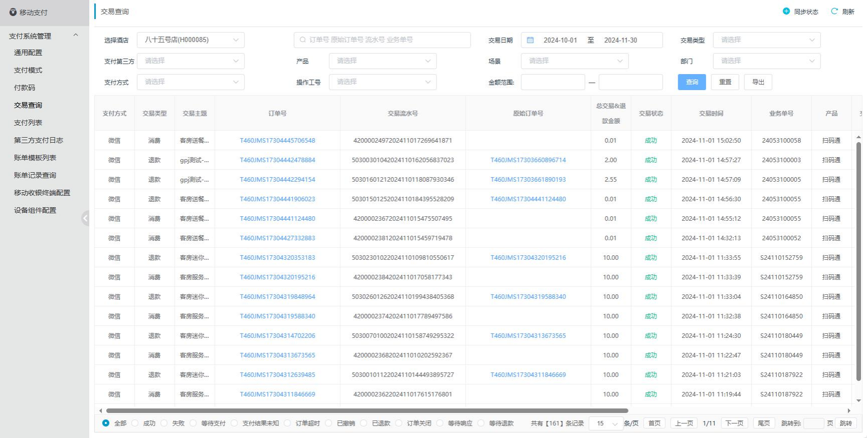 当酒店启用支付平台时,扫码通使用支付宝/微信支付的记录可再此页面进行查询。(如图 1.5.3-1 所示)