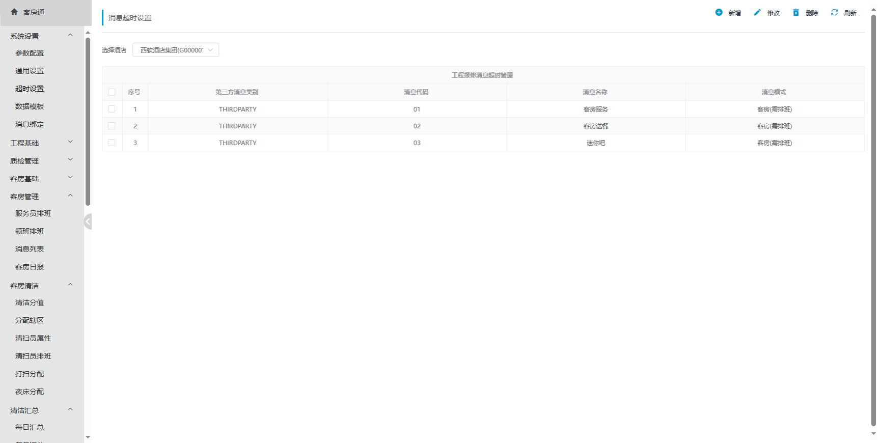 可在酒店集团下配置第三方消息的消息名称和消息模式。(如图 1.6.3-1 所示)