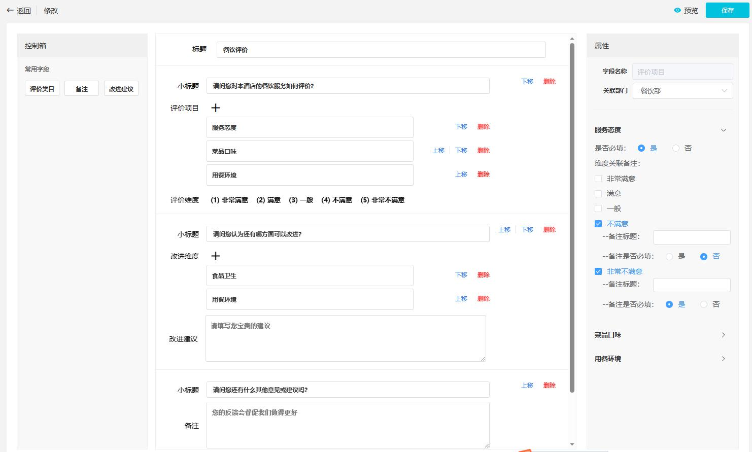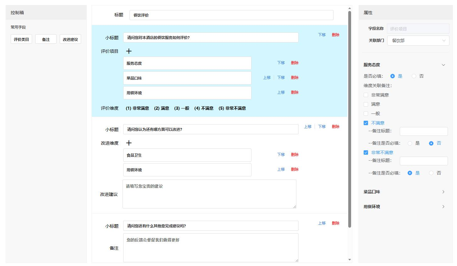 选中已添加评价项目的【评价类目】,属性区可设置或更改关联部门,还可对已添加的