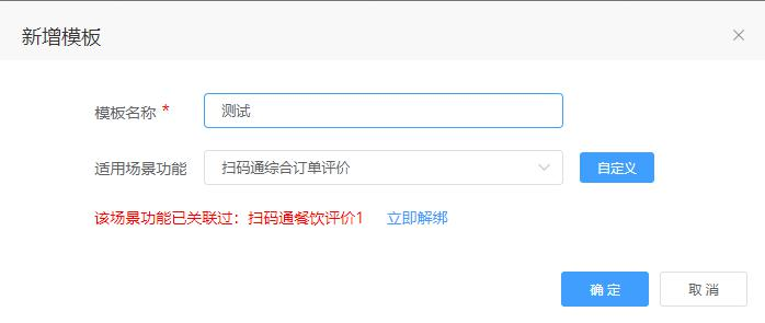 4、 模板所选适用场景功能选择已被其余模板绑定,则会额外显示提示“该场景功能已
