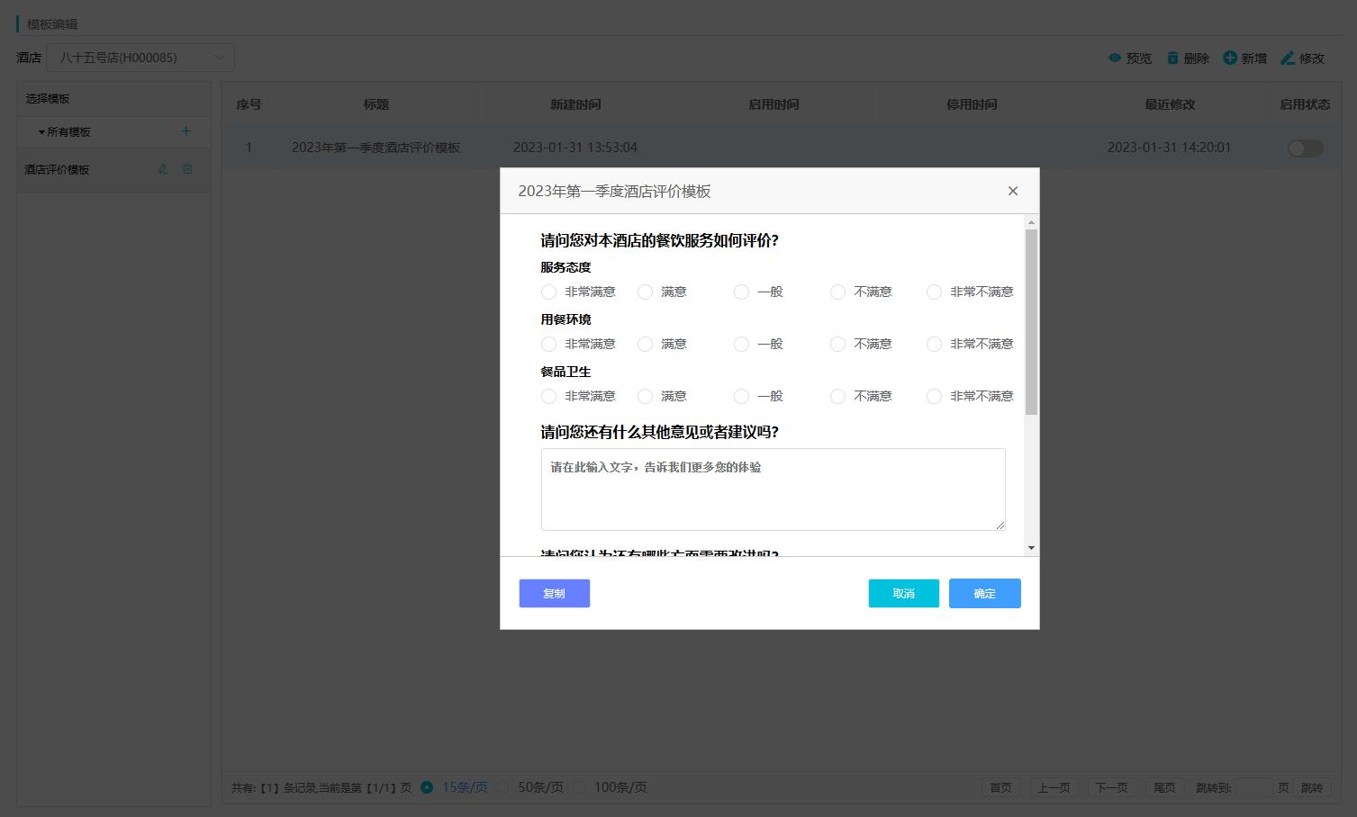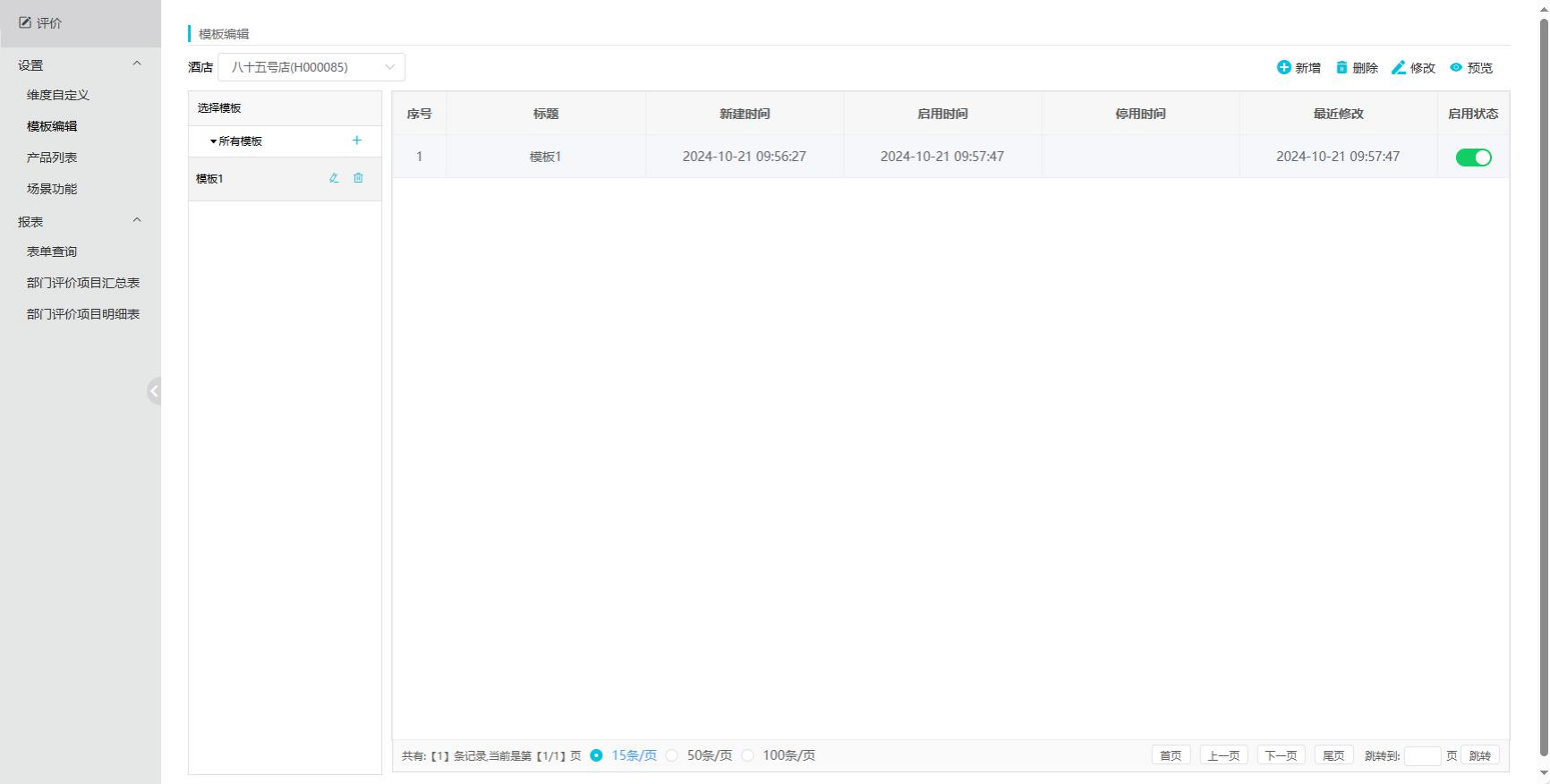 左侧显示已选酒店下的所有评价模板,右侧显示左侧选中的模板对应的明细,可新增、修改、