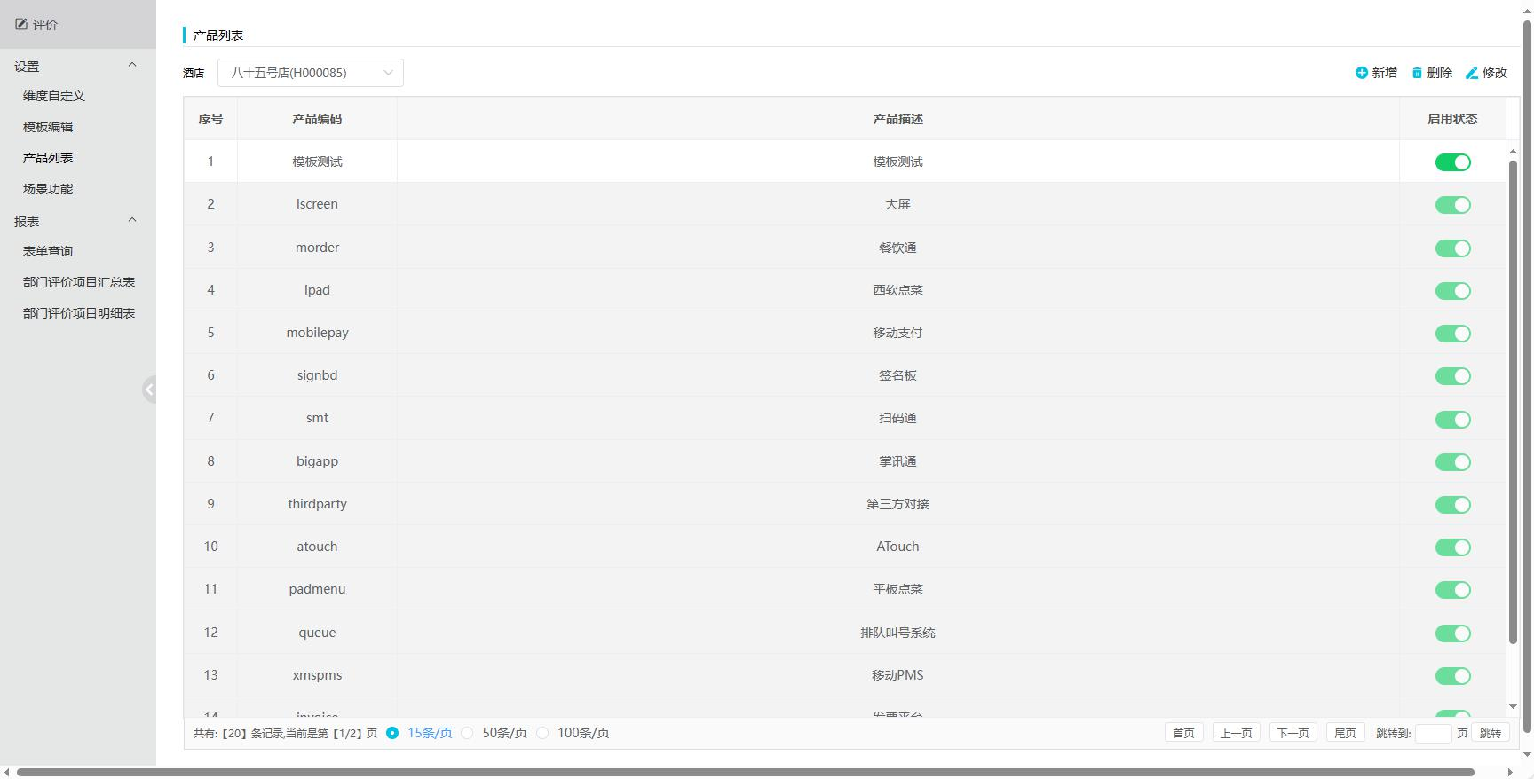 移动后台登录后,单击〖评价〗,展开设置,单击〖产品列表〗,打开产品列表页(如