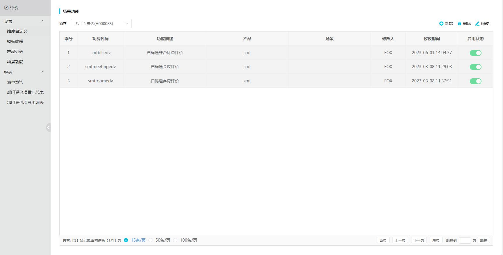 会议评价,可选择酒店,新增、修改、删除场景功能。