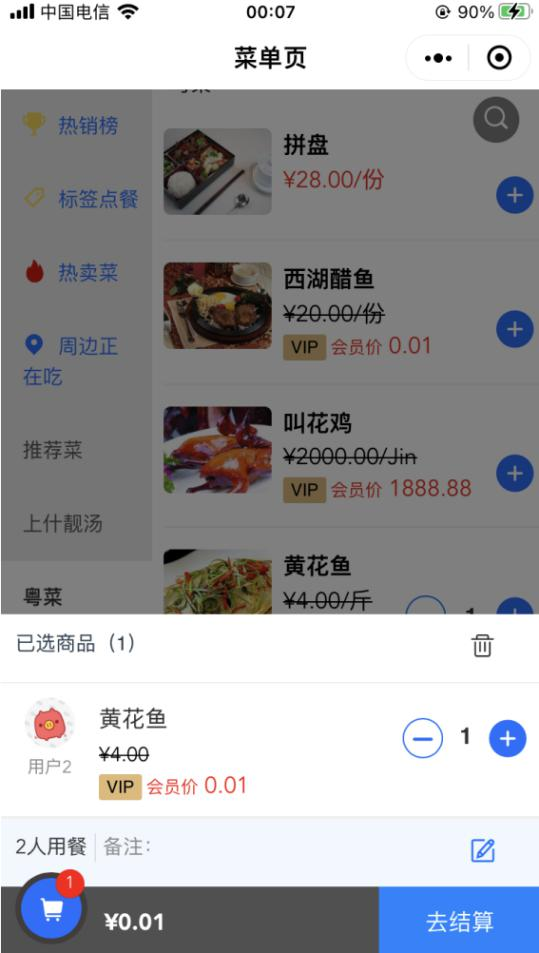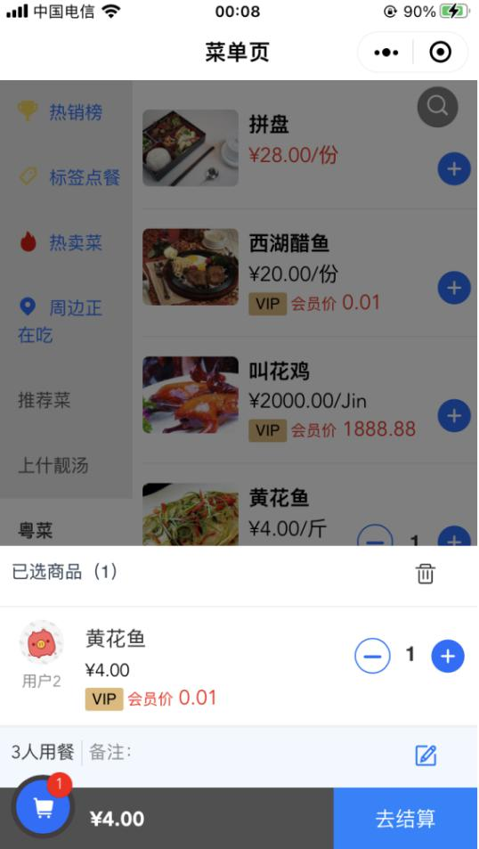 d. 绑定了会员卡,菜品列表显示会员价和原价,原价被删除(如图 2.1.1.1-13 所示)。