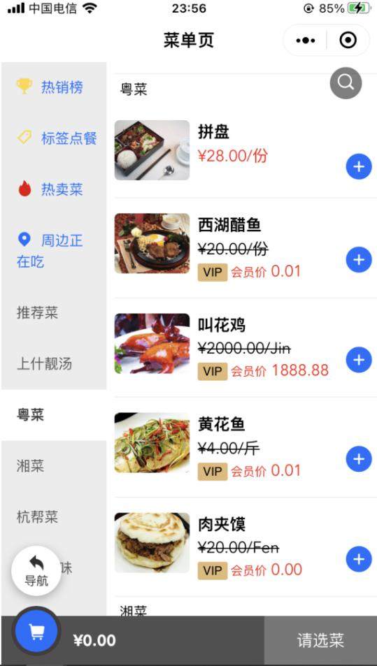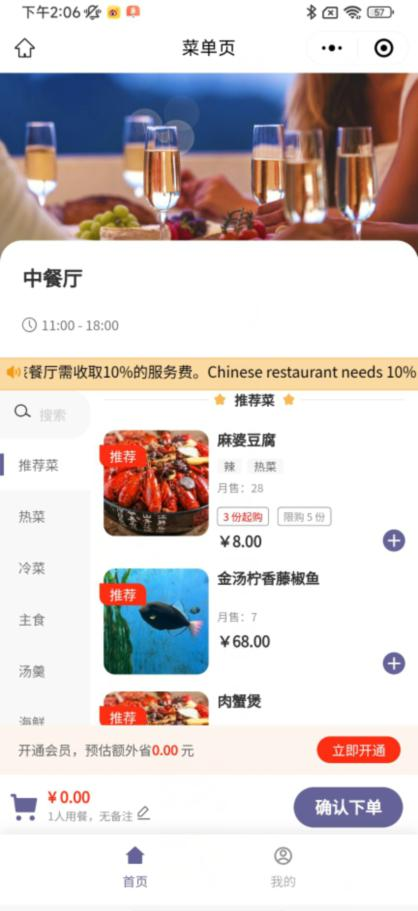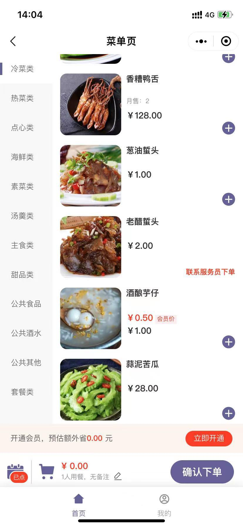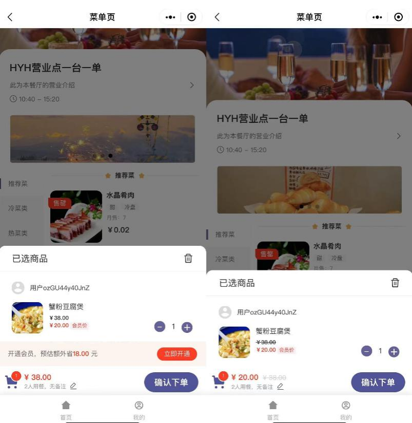 若开启会员卡功能,且已绑定会员卡,无会员价的菜品只显示原价。有会员价的菜品显