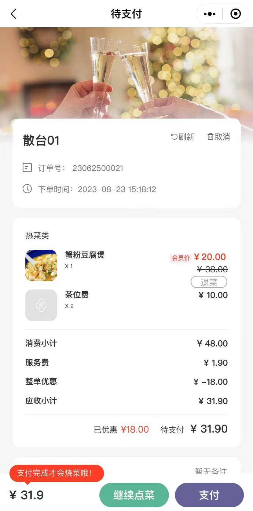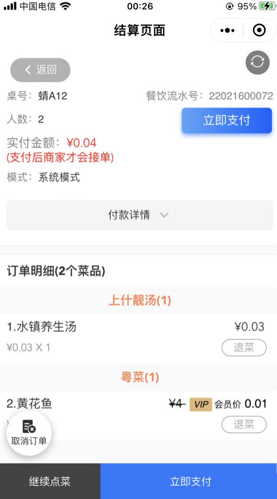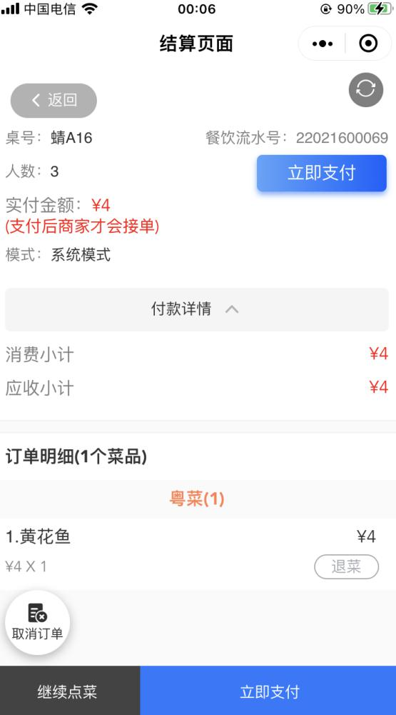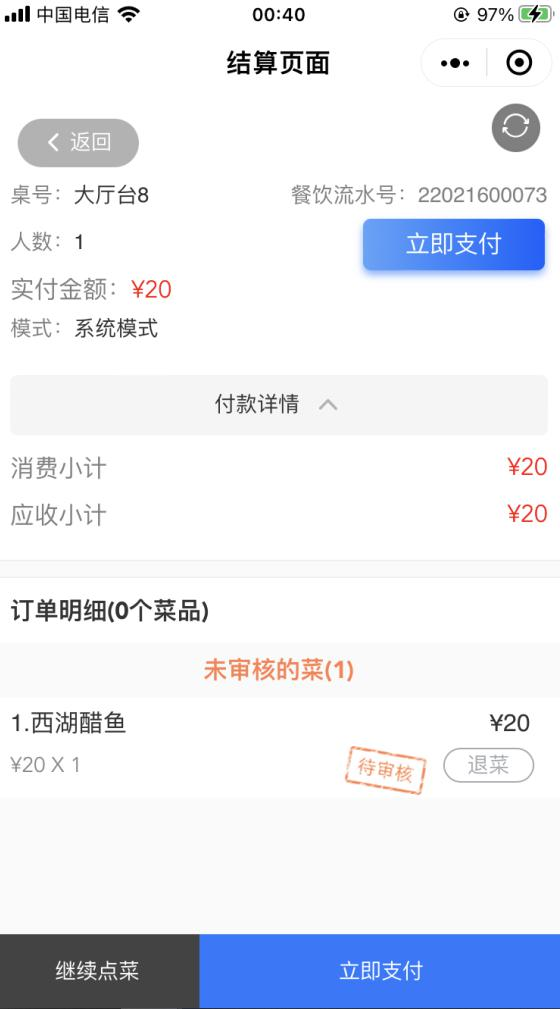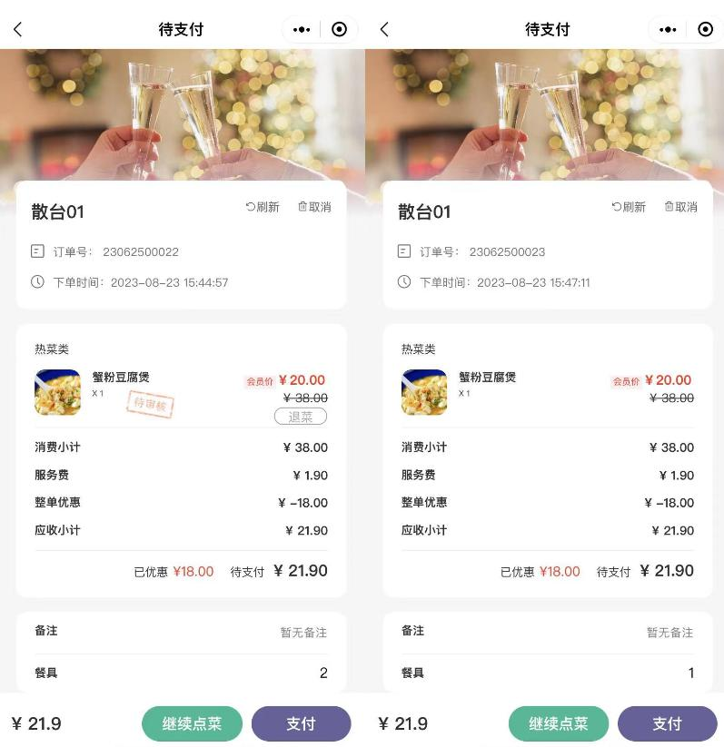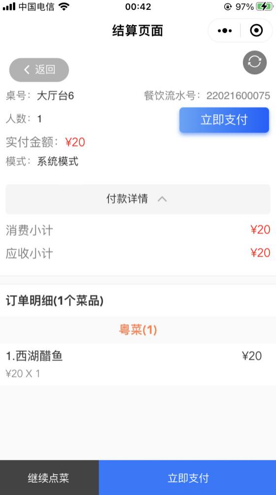 除了不会跳转到人数选择页面外,其余同开启用餐人数后付模式一致,此处不再赘述。