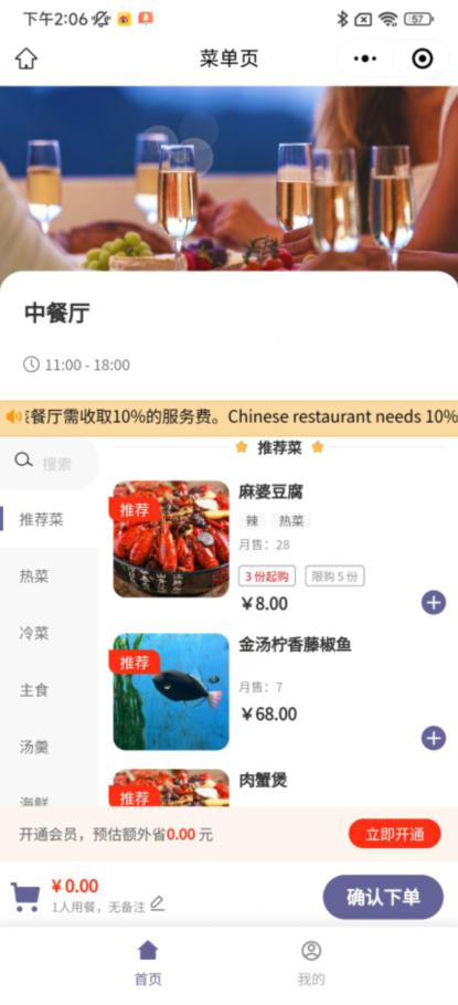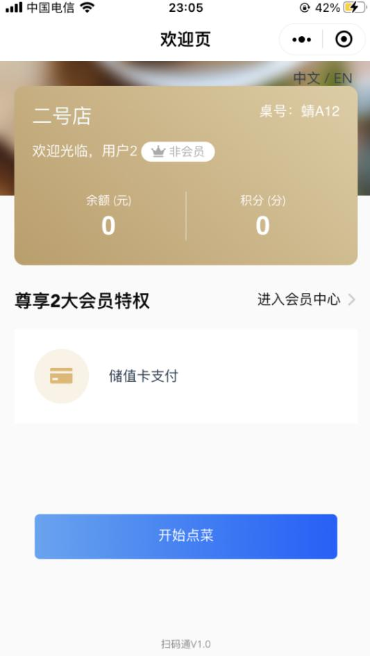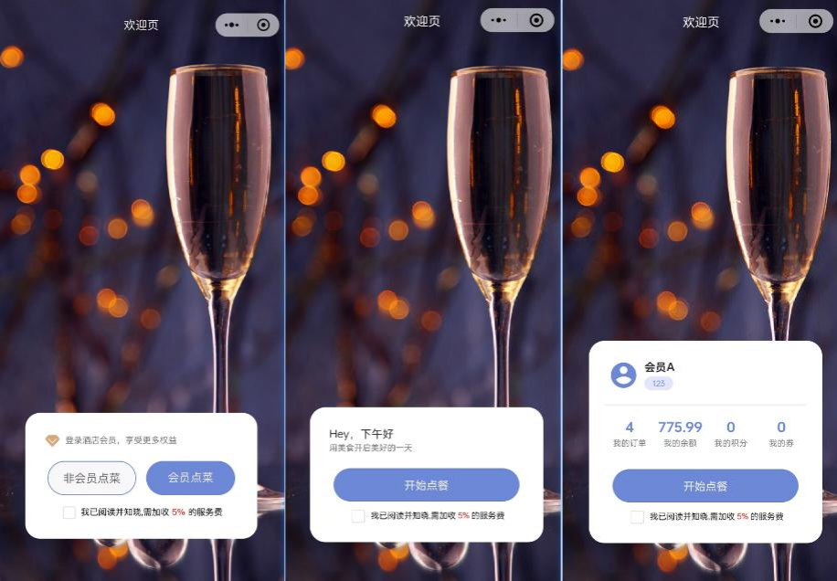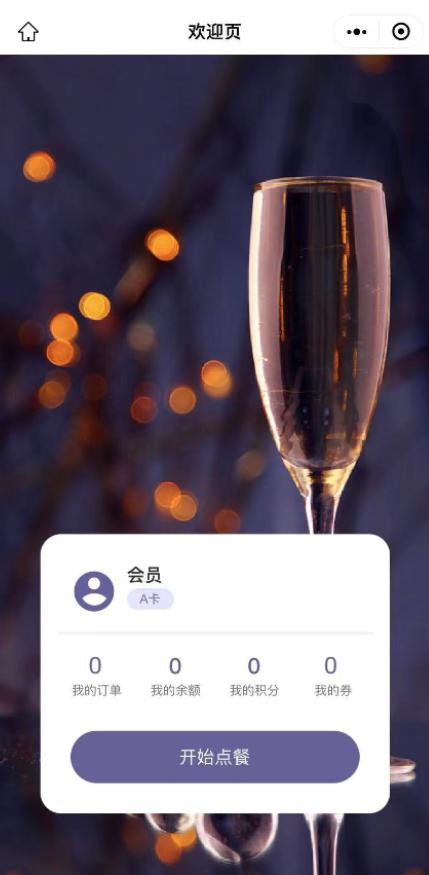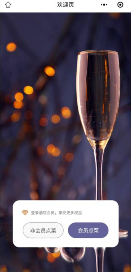 若移动后台开启会员卡功能,且未绑定会员卡,欢迎页上方显示酒店、桌号、用户昵称、