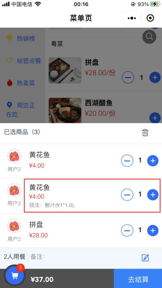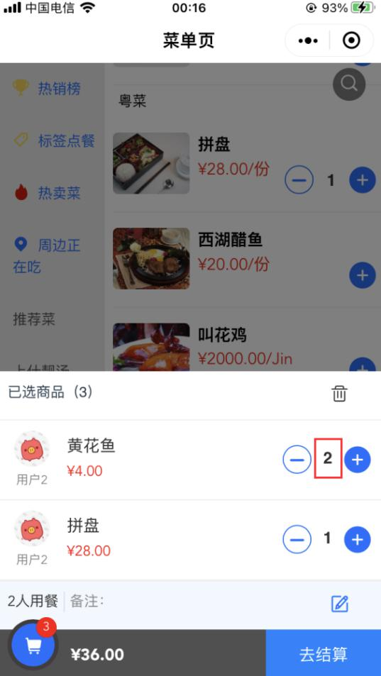 8、 菜单页所有已下单菜品会有相应的标识。(如图 2.1.1.1-49 所示)