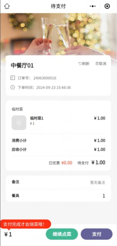 2、 先付模式下单后,左下角提示“支付完成才会烧菜”即只有支付后商家才会接单,