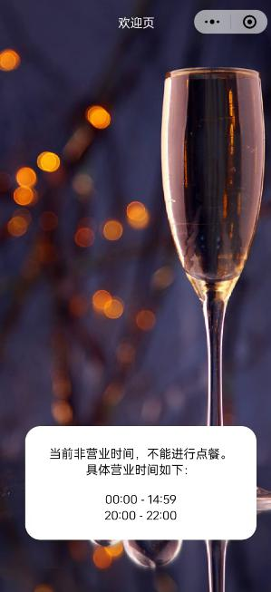 2、 若当前非营业时间,欢迎页开始点菜按钮隐藏,提示当前非营业时间不能点餐,显